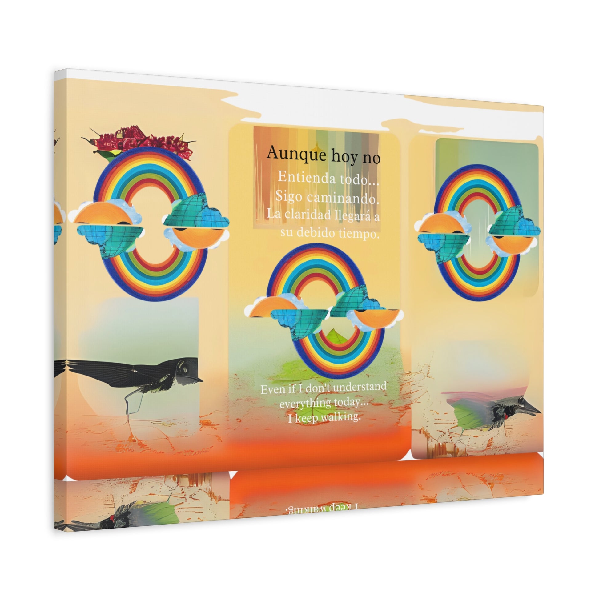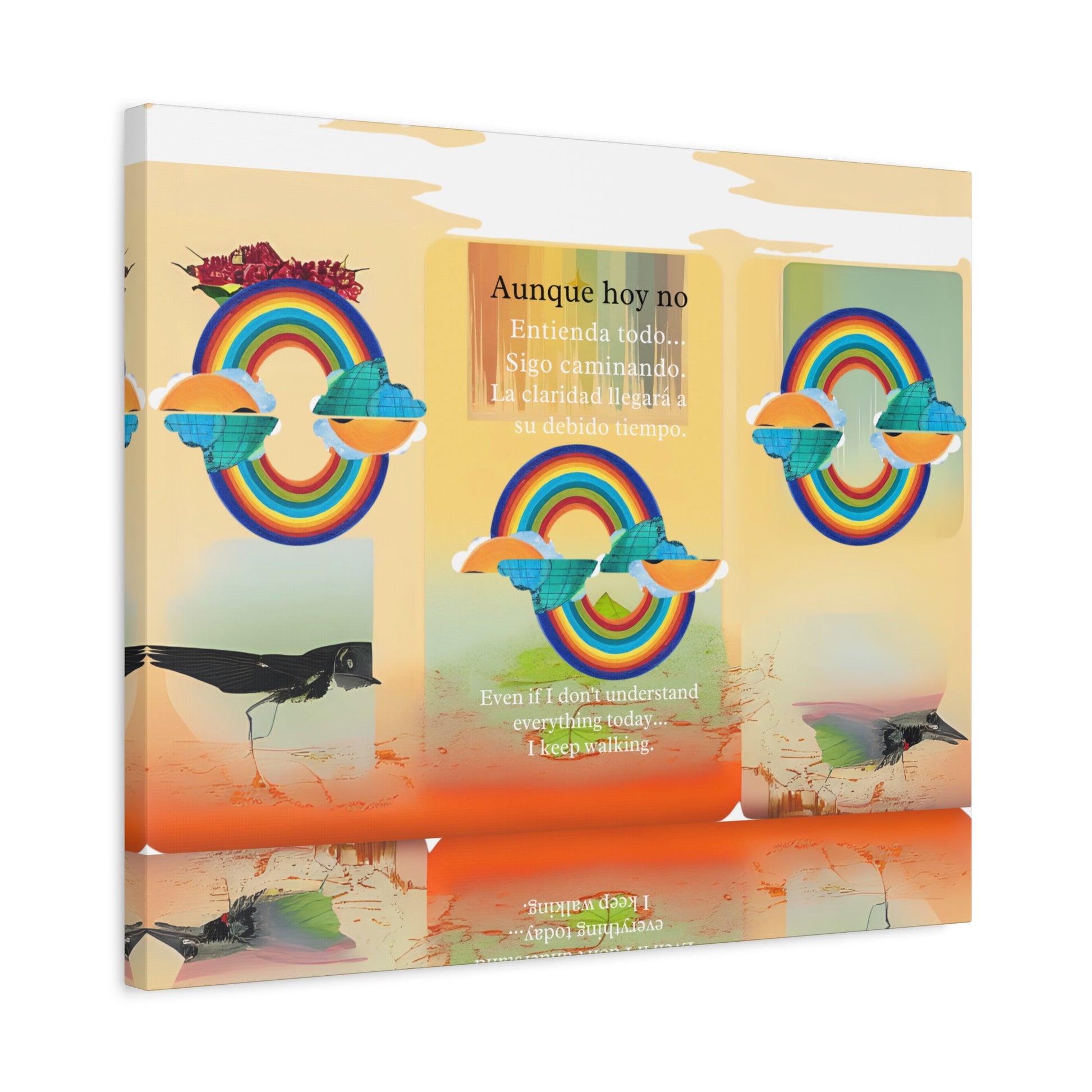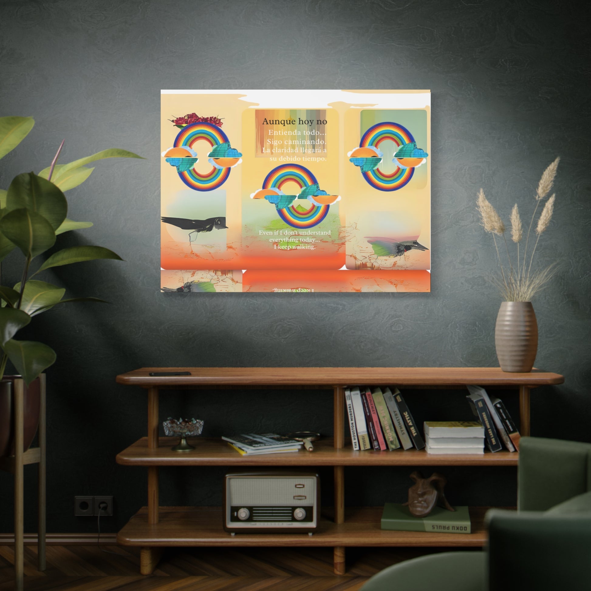 Bring light and inspiration into your home with this vibrant rainbow canvas print. Featuring arcs of color, birds, and soft flowing textures, this artwork carries a meaningful message:
