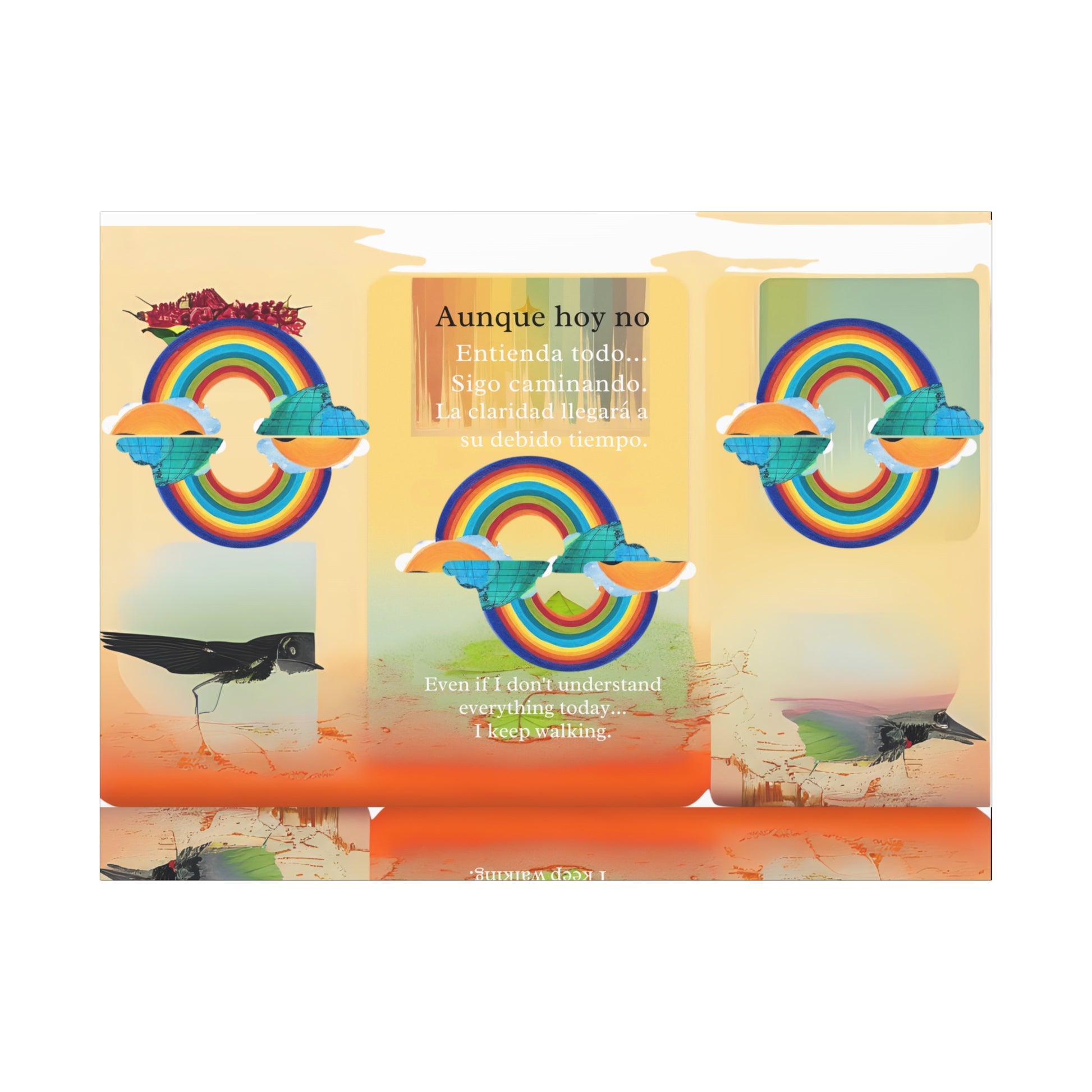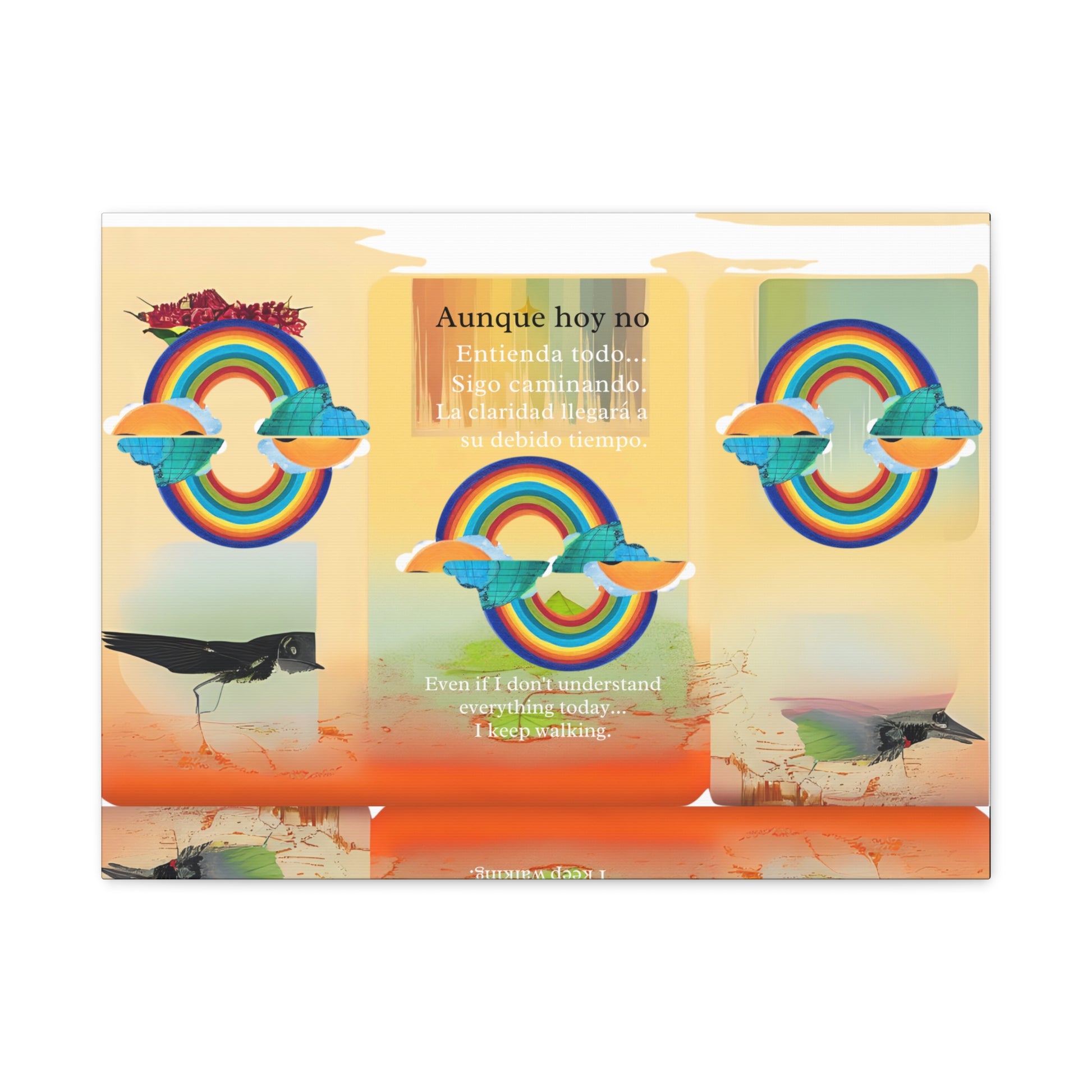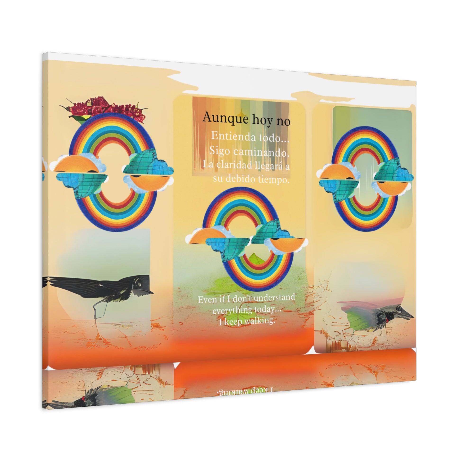 Bring light and inspiration into your home with this vibrant rainbow canvas print. Featuring arcs of color, birds, and soft flowing textures, this artwork carries a meaningful message: